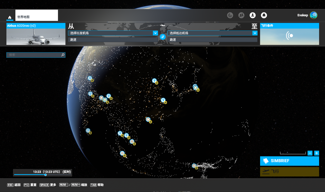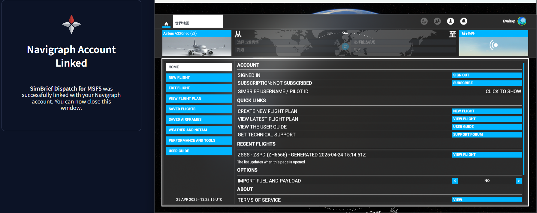 先去Navigraph注册一个账户,然后到Navigraph的下载页面安装MSFS 2020的SimBrief插件,装完后选择世界地图会显示: