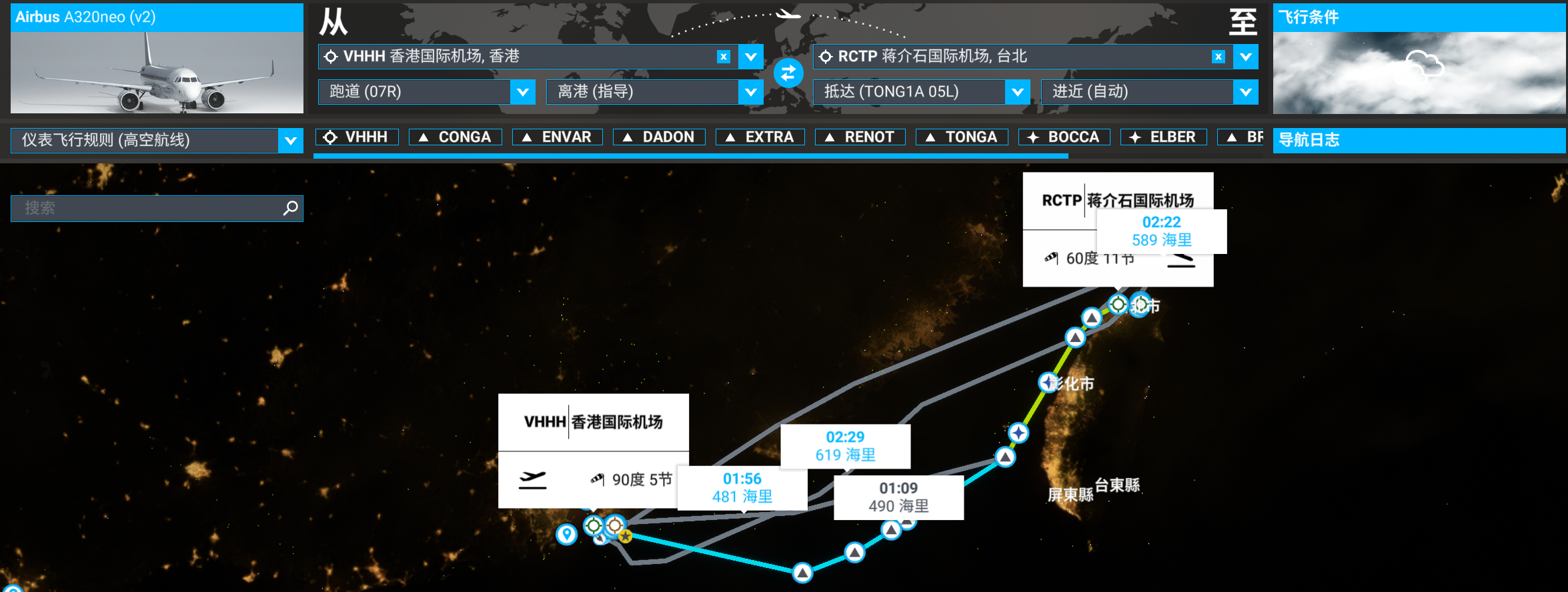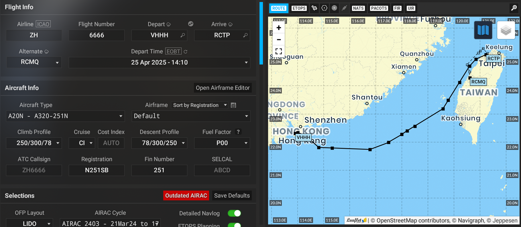 可以看到生成的飞行计划从VHHH起飞,降落RCTP,备降RCMQ。