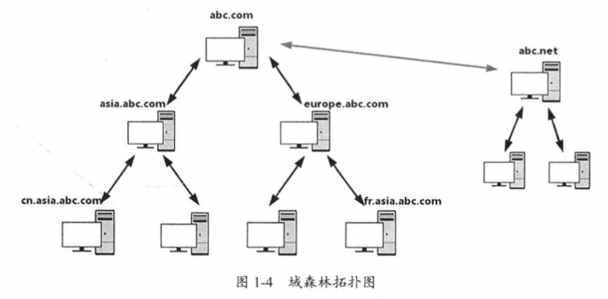 域森林是指多个域树通过建立信任关系组成的集合。例如,在公司兼并场景中,某公司使用域树abc.com,被兼并公司本来有自己的域树abc.net,由于abc.net无法挂在域树abc.com下,此时建立信任关系建立域森林即可保留其本身特性的同时与管理资源,如图: