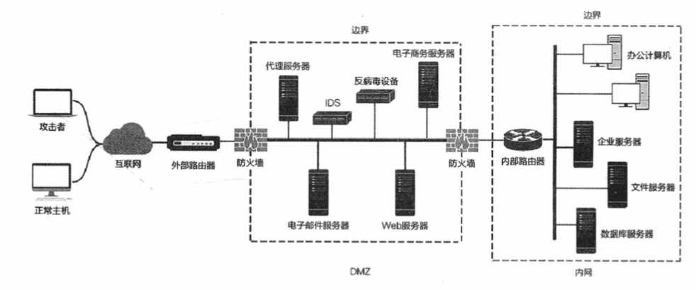 在网络边界一般会部署防火墙以及入侵检测、入侵防御产品等。如果有Web应用,还会设置WAF,从而更加有效地保护内网。