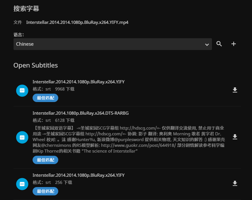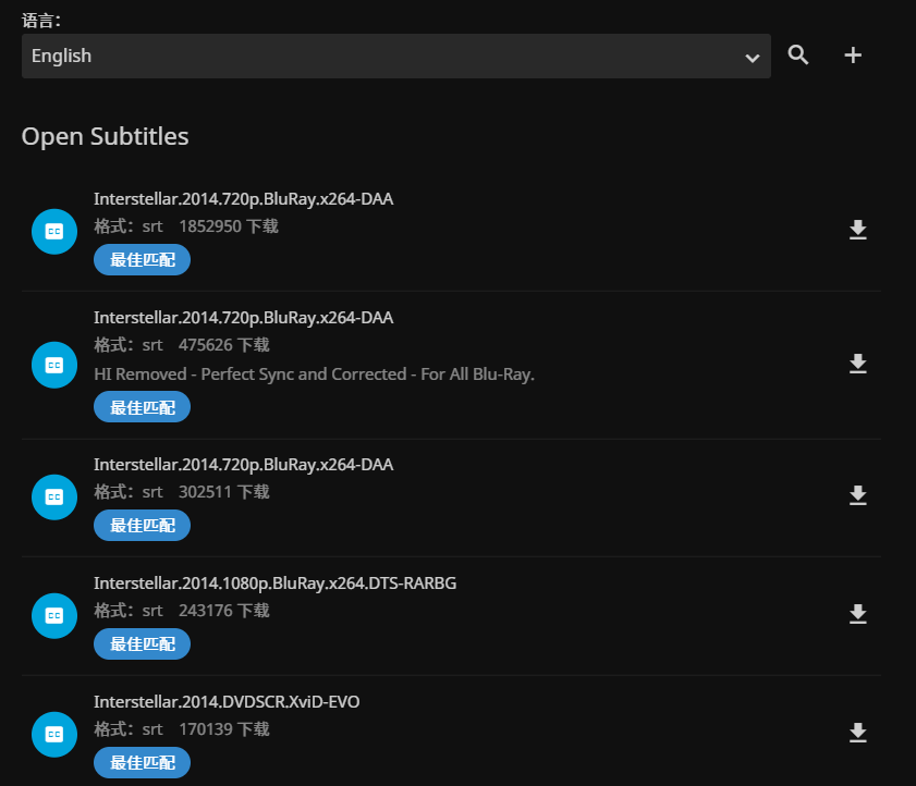 如果配置好上述的插件,可以搜索到对应语言的字幕: