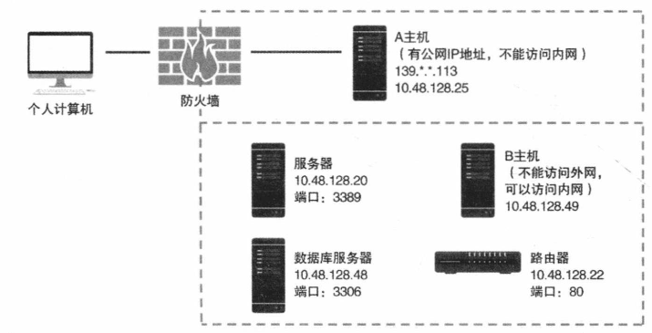 如图,如果A主机只能访问B主机,B主机可以访问内网但是不能访问外网: