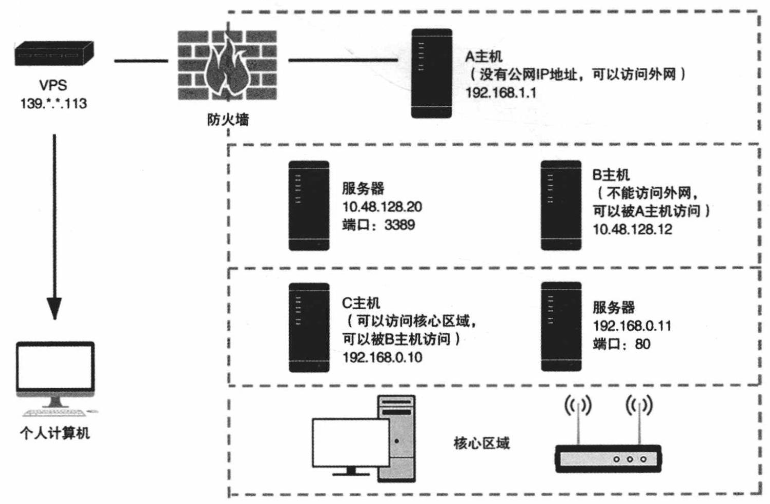 隧道就是一种绕过端口屏蔽的通信方式。防火墙两端的数据包通过防火墙所允许的数据包类型或者端口进行封装,然后穿过防火墙与对方进行通信;数据包到达目的地时,将数据包还原,并且将还原后的数据包发送到对应的服务器上。
